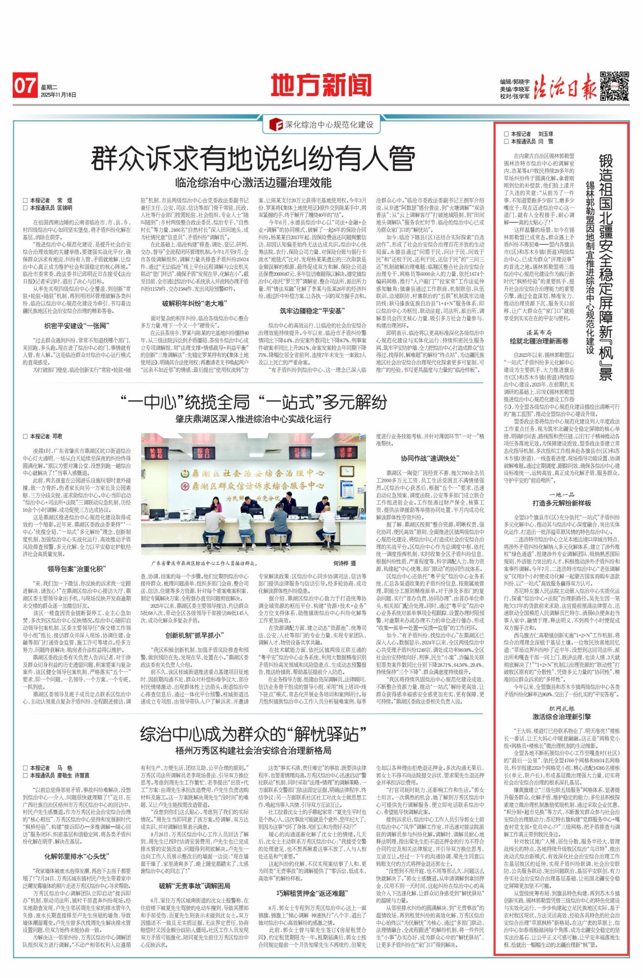 2025年11月18日《法治日報》第7版刊發(fā)了《鍛造祖國北疆安全穩(wěn)定屏障新“楓”景 錫林郭勒盟因地制宜推進(jìn)綜治中心規(guī)范化建設(shè)》的文章,報道了自2023年以來,錫林郭勒盟以“一站式”矛盾糾紛多元化解中心建設(shè)為主要抓手,大力推進(jìn)旗縣市(區(qū))和蘇木鄉(xiāng)鎮(zhèn)(街道)兩級綜治中心建設(shè)。2025年,在前期扎實調(diào)研的基礎(chǔ)上,印發(fā)《錫林郭勒盟推進(jìn)綜治中心規(guī)范化建設(shè)工作指引》,為全盟各級綜治中心規(guī)范化建設(shè)描繪出清晰可行的“施工藍(lán)圖”,推動全盟綜治中心建設(shè)升級。