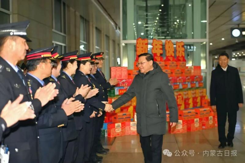 2月13日,自治區(qū)黨委書記、人大常委會主任王偉中在呼和浩特火車東站調(diào)研春運期間人流車流、安全保障等情況,看望慰問工作人員。草原云·內(nèi)蒙古新聞網(wǎng)記者 馬建兵 攝