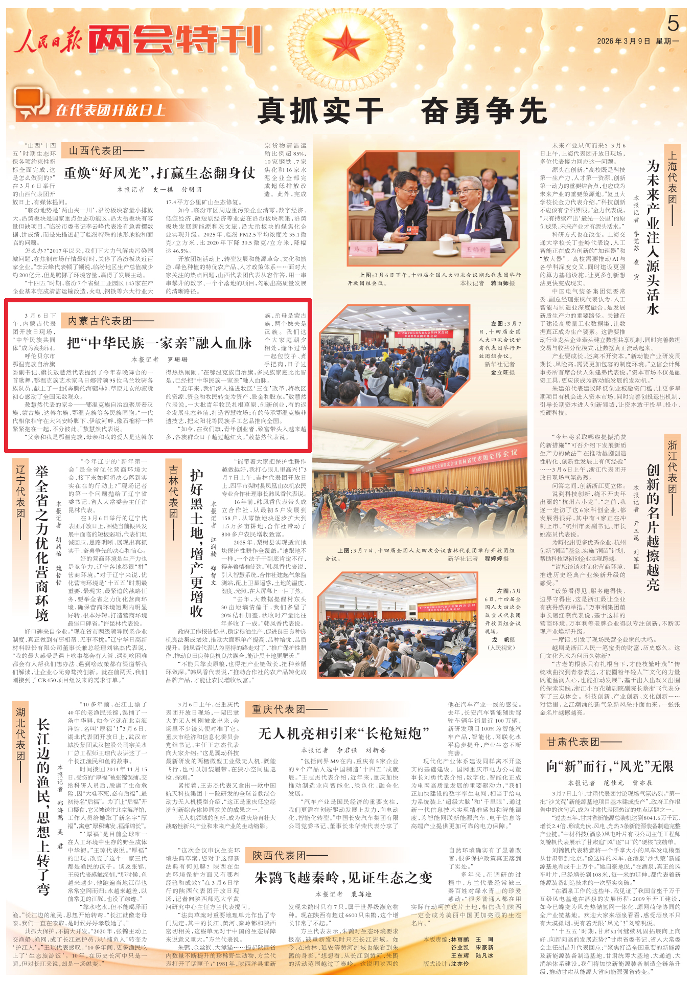 2026年3月9日,《人民日報》第5版刊發(fā)題為《內(nèi)蒙古代表團——把“中華民族一家親”融入血脈》一文,報道了3月6日下午,內(nèi)蒙古代表團開放日現(xiàn)場,“中華民族共同體”成為高頻詞。