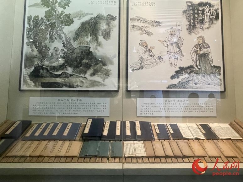 許慎文化園東配殿叔重堂內(nèi)陳列的資料及壁畫。人民網(wǎng)記者 劉微攝