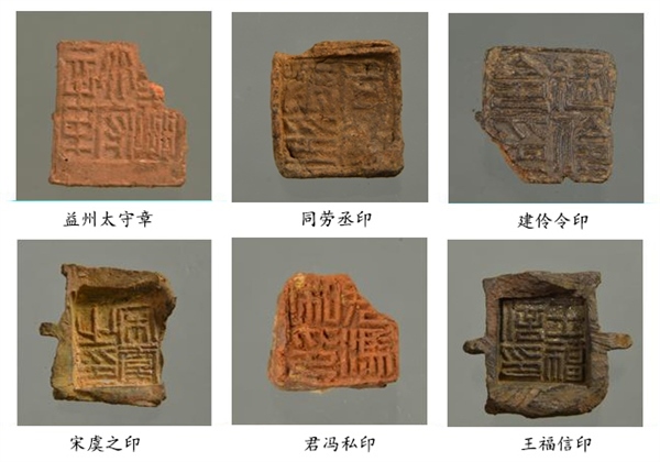 封泥集中出土于北部發(fā)掘區(qū)東北角的河道廢棄堆積中,共計(jì)837枚。主要為官印封泥和私印封泥,其中官印封泥有“益州太守章”“建伶令印”“同勞示印”等,涵蓋了漢代益州郡 24 縣中的20個(gè)縣名。出土帶字簡(jiǎn)牘殘片 1000 余枚,不帶字的簡(jiǎn)牘殘片近萬枚。其中,帶字簡(jiǎn)牘中釋讀出“滇池以亭行”“建伶”“始元四年”等文字,應(yīng)是公文文書。