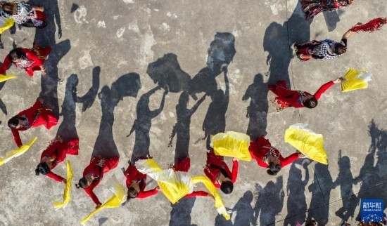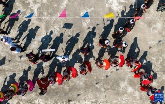 3月2日,當?shù)厝罕娕c來自各地的游客踩著相同的鼓點進場舞蹈(無人機照片)。