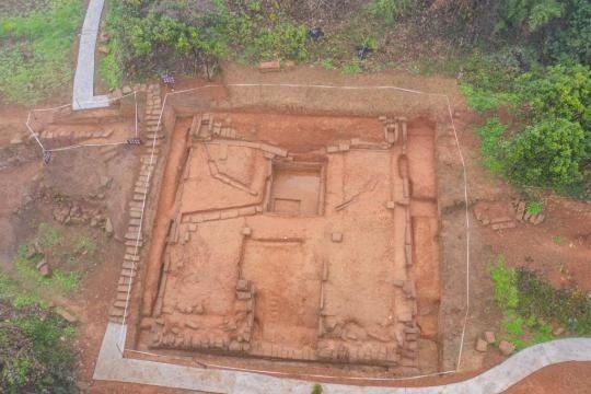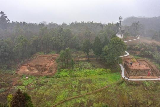 這是2月9日在重慶合川釣魚城遺址拍攝的新發(fā)掘出的類似闕臺(tái)建筑的基址(無人機(jī)照片)。新華社記者 黃偉 攝