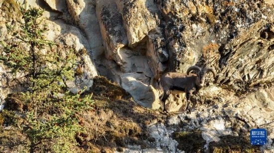 5月11日在內(nèi)蒙古賀蘭山國(guó)家級(jí)自然保護(hù)區(qū)拍攝的巖壁上的巖羊(無人機(jī)照片)。