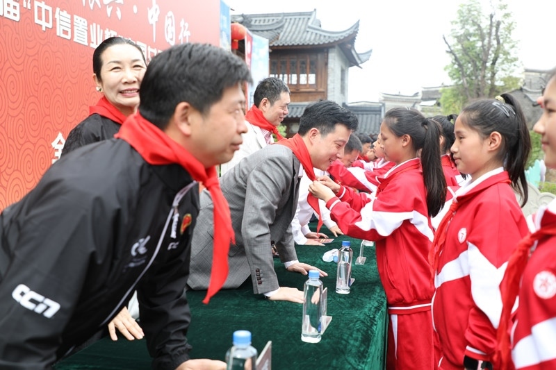 中國圍棋協(xié)會主席林建超(前排中)給全國圍棋特色學校授牌。人民網(wǎng)記者 李乃妍攝