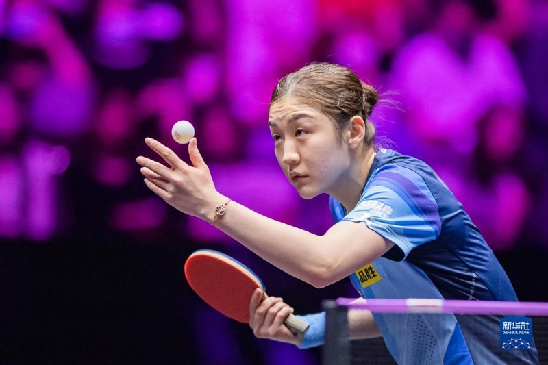2023年4月11日,陳幸同在比賽中回球。當(dāng)日,在河南新鄉(xiāng)舉行的世界乒乓球職業(yè)大聯(lián)盟(WTT)新鄉(xiāng)冠軍賽女單首輪比賽中,中國(guó)選手陳幸同以3比0戰(zhàn)勝日本選手木原美悠,晉級(jí)十六強(qiáng)。新華社記者 郝源攝