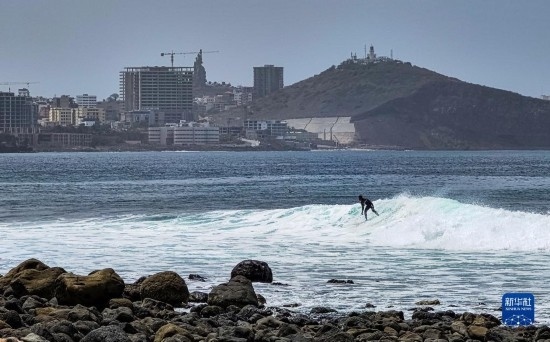 5月14日,一名沖浪愛好者在塞內(nèi)加爾首都達(dá)喀爾的海邊沖浪。