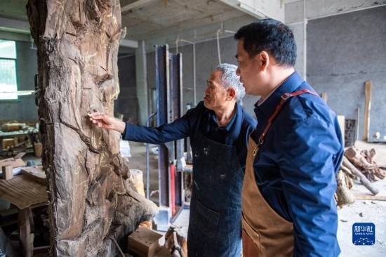 5月23日,在洞口縣巖山鎮(zhèn)陽家山村,洞口木雕非遺傳承人傅立先(左)和父親傅金林在創(chuàng)作木雕作品。