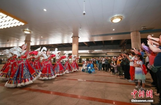 5月28日,北京援藏重點(diǎn)支持項(xiàng)目——2023年首趟“心連心·京藏號(hào)”旅游列車載著400多名游客從北京西站發(fā)車。該旅游列車全程共計(jì)14天,將途經(jīng)西寧、拉薩、林芝、山南等地。圖為舞蹈演員在站臺(tái)上跳起藏族舞蹈為游客送行。