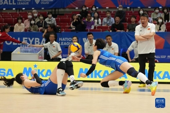 6月2日,中國(guó)隊(duì)球員袁心玥(右)在比賽中救球。新華社記者 張笑宇 攝