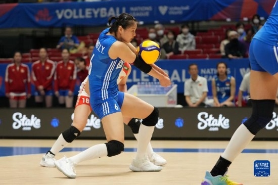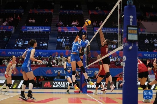 6月2日,中國(guó)隊(duì)球員袁心玥(中)在比賽中扣球。新華社記者 張笑宇 攝