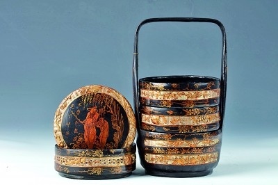 工藝技法與地方名品是漆器展示的兩個脈絡(luò),其中既有日用品,亦有陳設(shè)品。福建福州脫胎漆器如“鳳凰牡丹紋瓶”不僅輕巧靈動,且圖案精美,色彩豐富。北京漆器以雕漆見長,造型古樸,裝飾典雅。江蘇揚州漆器兼具螺鈿與雕漆工藝,裝飾頗有文人趣味。福建永春郭振盛所造“金漆彩繪提盒”富有裝飾性,多用于迎神祭祖、民間嫁娶和走親訪友。四川成都“推光漆果盒”以黑地博古圖案表達“壽考神仙”之題,盒內(nèi)分兩圈九格,分髤沉穩(wěn)五色,既實用又美觀。四川涼山彝族漆器則以木為胎,質(zhì)樸粗獷,多髹紅、黃、黑三色,分別象征著勇敢、光明與莊重。在漆器單元的“彝族漆器圖案內(nèi)涵”小專題中,觀眾從自然、動植物、生產(chǎn)生活等多個類別的圖案中得以了解彝族人民對自然的崇拜與敬畏。