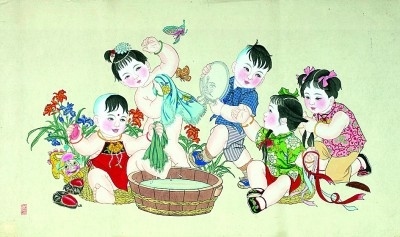 將秦瓊、尉遲恭的門神形象立于展廳中一扇大門的兩側(cè),頓時營造出威嚴(yán)的氛圍。參展的年畫多刻印精細,描繪精致,題材分為驅(qū)邪納福、戲曲傳說、世俗生活和新年畫等。天津楊柳青年畫既有名家錢慧安、高桐軒舊版新印的名作,亦有青年畫家創(chuàng)作的新題材,如那啟明表現(xiàn)豐收題材的《金粟碧波》,邵文錦贊頌解放婦女、促進生產(chǎn)的《山鵲別處啼》,張鸞基于傳統(tǒng)年畫《五子奪蓮》創(chuàng)作的愛國衛(wèi)生題材年畫《五子愛清潔》等。濰坊楊家埠以“舊瓶裝新酒”創(chuàng)作新年畫,如《農(nóng)忙托兒所》上題有“爹媽安心去生產(chǎn),加緊建設(shè)新中國”。