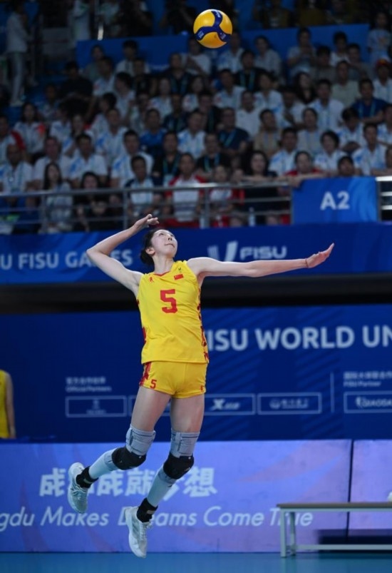 8月6日,吳夢潔在第31屆世界大學生夏季運動會女子排球金牌賽中發(fā)球。新華社記者 胥冰潔 攝