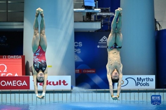 7月18日,中國(guó)選手司雅杰(右)/白鈺?shū)Q在混雙三米板比賽中。