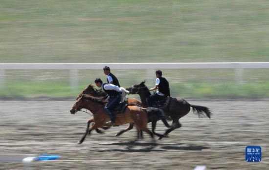 7月16日,牧民在昭蘇縣天馬旅游文化園的草原上遛馬。