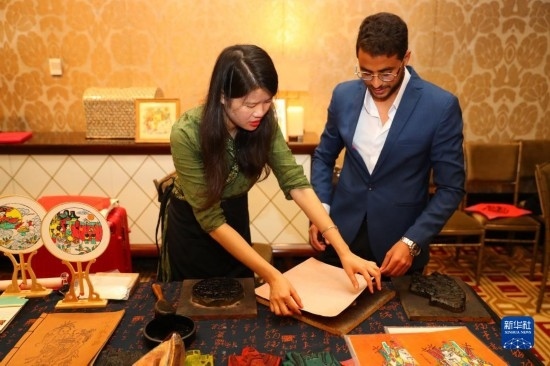 11月19日,在埃及開羅舉行的粵港澳大灣區(qū)世界級(jí)旅游目的地推介暨“魅力廣東”視覺展上,一名男子在非遺展區(qū)體驗(yàn)?zāi)景迥戤嬛谱鳌?/p>