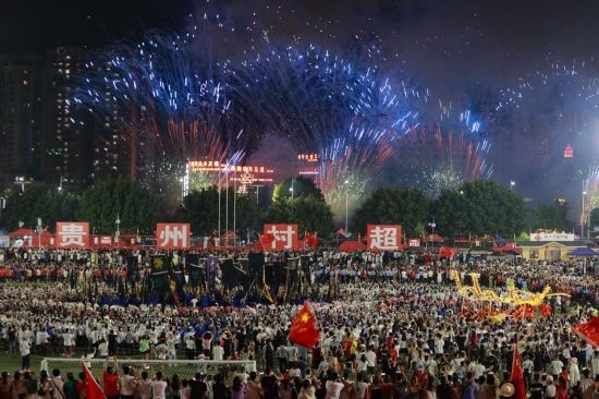 這是7月29日拍攝的“村超”比賽結(jié)束后的焰火表演。新華社記者 劉續(xù) 攝