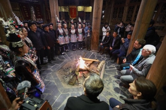 12月11日,榕江縣少數(shù)民族同胞用歌舞歡迎“學轉(zhuǎn)英超”培訓團隊。新華社記者 劉續(xù) 攝