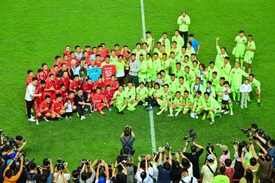 11月11日,貴州榕江“村超”聯(lián)隊與香港明星足球隊在比賽后合影。新華社記者 朱煒 攝