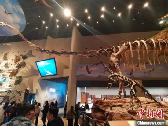 1月3日,中國古動物館(保定自然博物館)展出的擁有世界上最長脖子的中加馬門溪龍化石骨架。呂子豪 攝