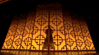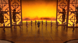 《詠春》來自舞劇《詠春》選段,已經(jīng)上演了百場,但在春晚是個特別的版本。為了創(chuàng)造出更加意蘊豐富的想象空間,總臺臺長慎海雄在推薦這個舞劇片段時,提出了幾個建議,包括演員服裝從黑色的香云紗改為絳紅色,男女主角之間的關(guān)系要從男主角一一過招“大敗”女主角改為相互切磋武藝,開場以男主角的武術(shù)剪影來增強吸引力,通過使用剪影效果來展現(xiàn)“葉問”的出場。當(dāng)燈光亮起,窗欞上“詠春拳”三個書法大字淡去,“葉問”的剪影如同舞動的水墨畫一般,隨即演員閃身舞出屏風(fēng),影子與真身共舞。由虛入實,由平面到立體,“剪影”的設(shè)計讓短短半分鐘的獨舞大大增加了層次感和觀賞性,為空曠的舞臺創(chuàng)造出一個“頂天立地”的葉問之影,視覺震撼瞬間放大,堪稱畫龍點睛之筆。