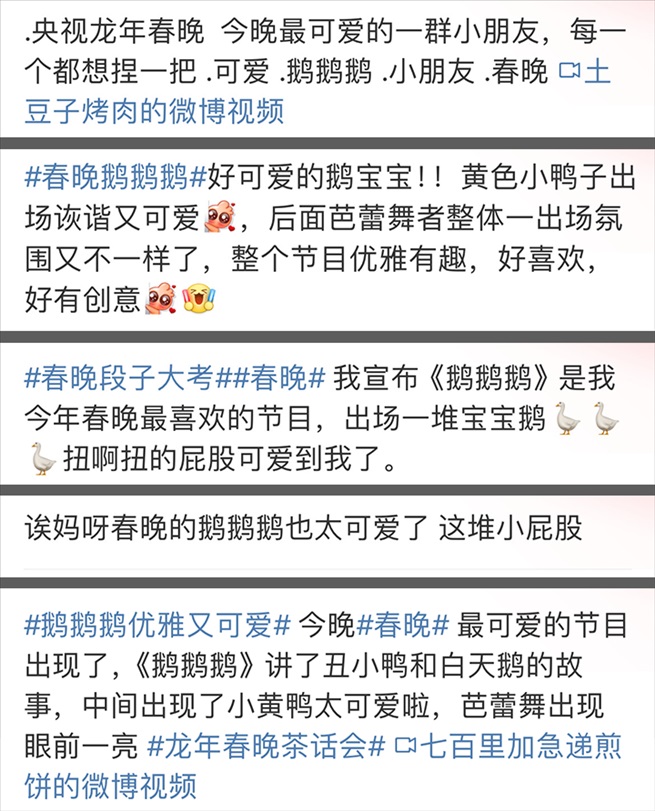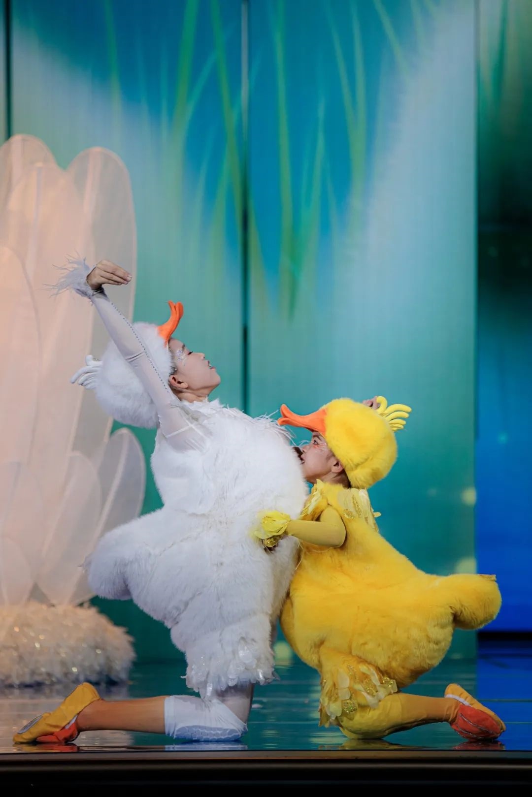 當(dāng)你提“鵝鵝鵝”,自然要期待“曲項向天歌”。駱賓王、唐詩宋詞、中華文化....看到節(jié)目單上的題目《鵝鵝鵝》,大概很多觀眾都以為是要詠詩。當(dāng)大幕開啟,柴可夫斯基的《天鵝湖》奏起,氣氛瞬間變得端莊典雅了,可接下來出場的是一群圓滾滾、扭著屁股的小小鵝,這波反差萌,讓網(wǎng)友直呼“創(chuàng)意絕了”。