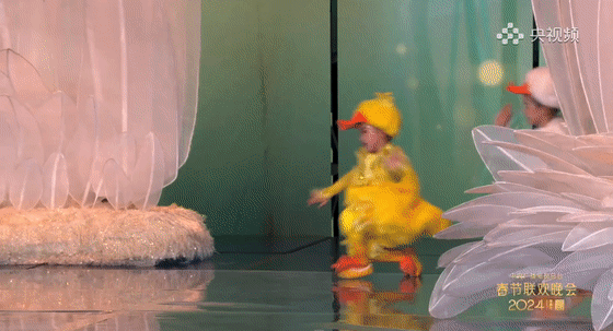 每年春晚都少不了兒童節(jié)目,導(dǎo)演組堅持兒童舞蹈要從孩子的眼睛看世界,必須符合孩子身體的表達。這些“小天鵝們”正是來自駱賓王的家鄉(xiāng)義烏,他們用自己的理解展現(xiàn)了《詠鵝》中“白鵝戲水圖”的獨特韻味。“跪游”的經(jīng)典動作把“紅掌撥清波”刻畫得惟妙惟肖,“翹屁股”更是萌翻了觀眾,左搖右擺的“矮子步”還是來自孩子們的鬼馬“創(chuàng)作”,整個舞蹈充滿了童趣純真。