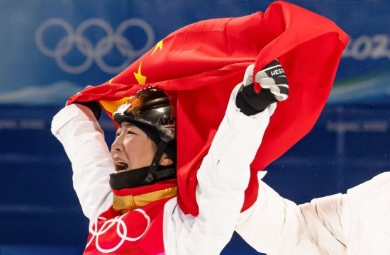 2022年2月14日,北京冬奧會(huì)自由式滑雪女子空中技巧決賽在張家口云頂滑雪公園舉行。中國(guó)選手徐夢(mèng)桃在奪冠后慶祝。新華社記者 肖藝九 攝