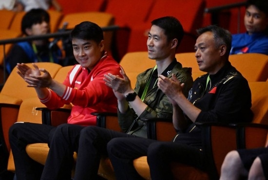 2023年5月26日,中國(guó)乒乓球協(xié)會(huì)副主席王勵(lì)勤(中)在南非德班進(jìn)行的2023年世界乒乓球錦標(biāo)賽男子單打四分之一決賽中觀戰(zhàn)。新華社記者 陶希夷 攝
