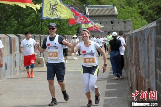 2023年5月21日,黃崖關(guān)長(zhǎng)城國際馬拉松賽在天津市薊州區(qū)鳴槍開跑。圖為國外選手在比賽中穿越黃崖關(guān)長(zhǎng)城。張彥 攝
