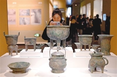 新館里專設(shè)了“世界的商文明”展覽。步入展廳,猶如穿越到世界各大文博機(jī)構(gòu)。兩側(cè)墻體還原了加拿大皇家安大略博物館、美國弗利爾美術(shù)館等外國文博機(jī)構(gòu)展出商代文物的場景。一張巨幅“商代文物海外收藏地圖”,述說著大量青銅器、玉器、刻辭甲骨等商代文物流散海外的歷史。