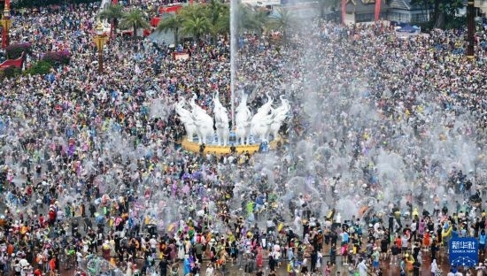 當日,云南省西雙版納傣族自治州舉行潑水狂歡活動,人們歡聚在景洪市潑水廣場,用相互潑水的方式互送祝福,慶祝潑水節(jié)。