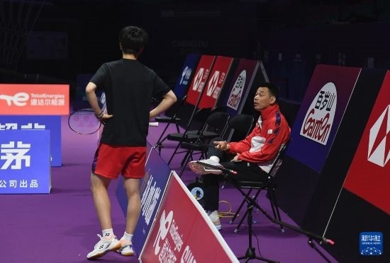 4月26日,中國羽毛球協(xié)會副主席夏煊澤(右)在訓(xùn)練中指導(dǎo)王祉怡。新華社記者 侯昭康 攝