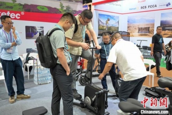 5月1日,采購商在廣交會上嘗試專業(yè)健身器械。中新社記者 陳驥旻 攝