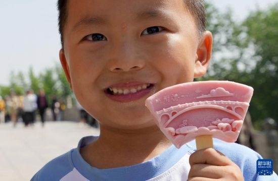 一名小朋友展示父母給買的趙州橋文創(chuàng)雪糕(4月25日攝)。新華社記者 王毓國 攝