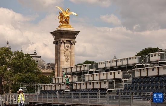 這是6月4日在位于法國巴黎市中心的亞歷山大三世橋拍攝的臨時(shí)比賽場地搭建現(xiàn)場。這里將是巴黎奧運(yùn)會(huì)多個(gè)比賽項(xiàng)目的終點(diǎn),包括公路自行車個(gè)人計(jì)時(shí)賽、游泳馬拉松、鐵人三項(xiàng)比賽。新華社記者 高靜 攝