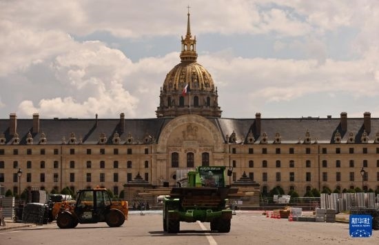 這是6月4日在位于法國巴黎市中心的榮軍院廣場拍攝的臨時(shí)比賽場地搭建現(xiàn)場。這里將在巴黎奧運(yùn)會(huì)期間舉辦射箭比賽。新華社記者 高靜 攝