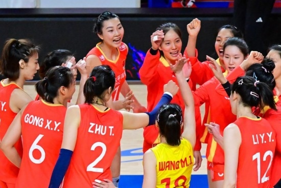 6月15日,中國隊球員在比賽中慶祝得分。新華社記者 盧炳輝 攝
