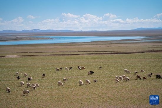 6月22日,羊群在色林錯湖畔草場上吃草。