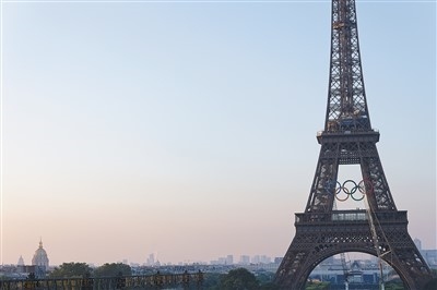 奧運(yùn)五環(huán)安裝在巴黎地標(biāo)性建筑埃菲爾鐵塔上。圖片來源:巴黎奧運(yùn)會官網(wǎng)