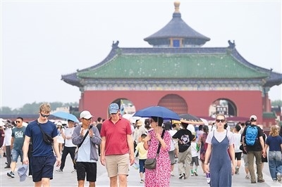 在北京天壇公園,外國游客在導游的帶領下游覽。新華社記者 鞠煥宗攝