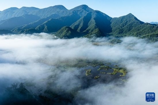 8月16日拍攝的神農(nóng)架大九湖國家濕地公園一景(無人機照片)。