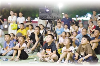 近日,在湖北省襄陽市??悼h體育場,孩子們?cè)谟^看電影。楊 韜攝(人民視覺)