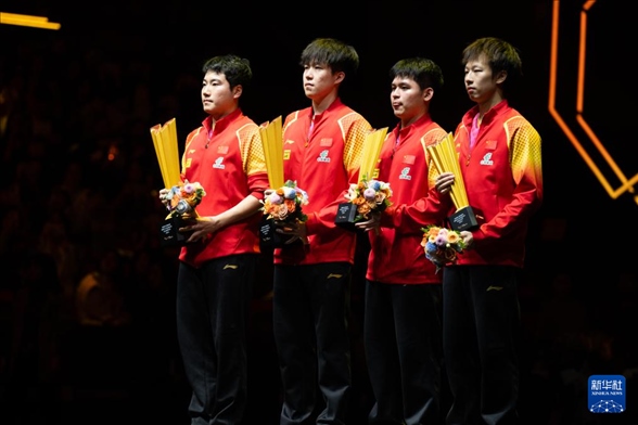 10月5日,冠軍王楚欽(右)/梁靖崑在頒獎(jiǎng)儀式上。新華社記者 張晨霖 攝