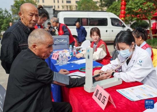 10月9日,在河西埭村文化禮堂前,醫(yī)務人員在給老人們免費體檢。