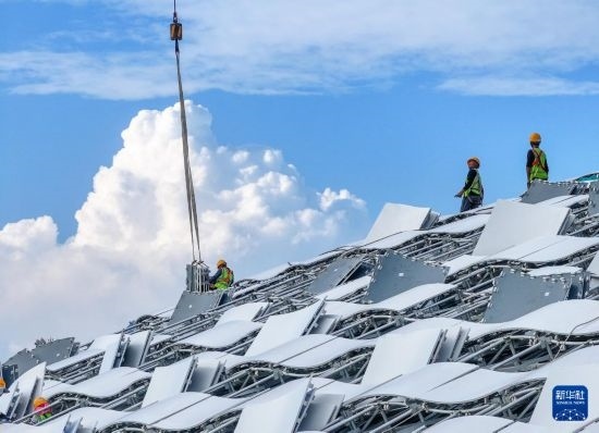 10月16日,中建深裝施工人員在深圳市體育中心專(zhuān)業(yè)足球場(chǎng)屋頂?shù)跹b幕墻材料(無(wú)人機(jī)照片)。