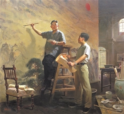 正在舉辦的第十四屆全國美術作品展覽進京作品展上,撲面而來的藝術形象是腳踏中華大地的各族人民,是中國近現(xiàn)代文化史上的先賢圣哲,是和我們一道相擁而立的堂堂中國人。這些形象剛強勇毅,如潮如云,傳遞著眾志成城的精神力量,扣動人心。譬如,呂鵬《山河頌》,以濃郁的色調,再現(xiàn)傅抱石、關山月兩位前輩創(chuàng)作《江山如此多嬌》的情景,鐫刻新中國美術史上重要一幕;鄔大勇《我心中的英雄》塑造了畫家少年時代的英雄偶像——錢學森等一代科學家。還有許多氣勢宏大的創(chuàng)作,它們既是社會生活、時代精神的藝術載體,又是美術工作者面對歷史、面對人民的激情熔爐。這些作品以人民形象為根基,深植時代沃土,構成歷史與現(xiàn)實相輝映的史詩畫卷。