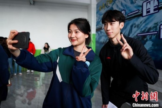 圖為浩門(mén)鎮(zhèn)(魯青)高級(jí)中學(xué)學(xué)生與梁育帥(右)尋求合照。薛蒂 攝