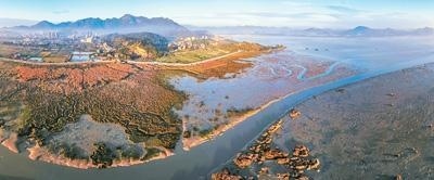 圖為閩江入??趶V闊的灘涂、被稱為“閩江口明珠”的瑯岐島以及日益繁榮的城鎮(zhèn)。